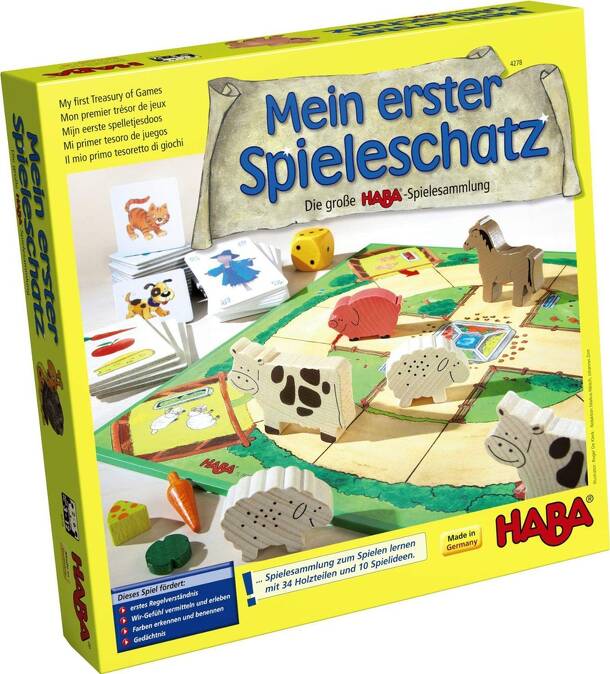 Mein erster Spieleschatz - Első játékgyűjteményem. Egy doboz - tíz játék! Játékok a tanyáról óvodásoknak. Háziállatok, gyümölcsök, zöldségek és tojások - négy táblával. Kisóvodás kortól játszható játékokat tartalmaz a doboz, amelyekben a gazdának kell együtt segíteni, akár az istálló körül az etetésben, akár bevásárláskor a piacon. Szín- és...