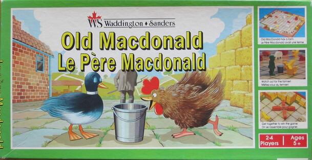 Be the first to fill Old Macdonald's Farm with animals. Contents include a spinner, and 4 game boards each with 6 animal puzzle pieces that fit inside them. The rules are very simple (the game is for ages 3+) and are included in their entirety: To start the game each player is given an Old Macdonald Farm board. Press out the animal shapes and lay them out...