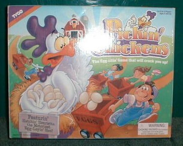 In Pickin' Chickens players try to be the first to get their trolley to the chicken as it lays an egg and then return the egg to their frying pan. The game features a chicken that squawks and moves. When the chicken stands players can roll their trolleys down a rail (by pushing forwards their frying pans which are attached to the rail, thus lifting it up)....