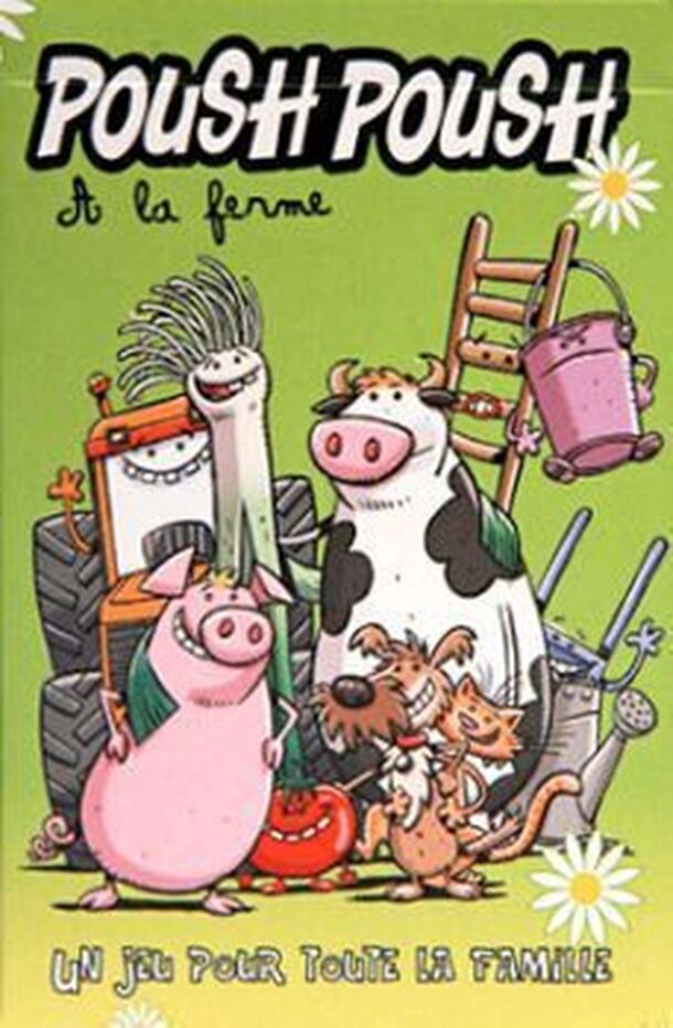 Equipment: Poush Poush à la ferme is a card game that contains 36 cards representing either animals, fruits and vegetables or tools from the farm (symbols). Each card has a colour, blue, green or pink and a number of symbols, varying from one to four. Goal of the game: The players are farmers. Each player plays his/her cards to draw unbroken lines of the...