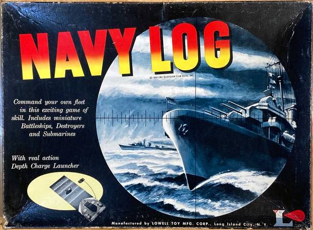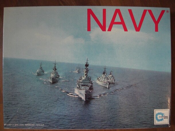 From the Rulebook: NAVY is a fantastic and all absorbing pastime in air - naval strategy in which aircraft carriers, cruisers, frigates, submarines, tenders and fighter planes - a total of thirty perfectly detailed models - engage in combat (on a sparkling blue sea plan, criss-crossed by meridians, parallels and clearcut coastlines) to conquer islands...