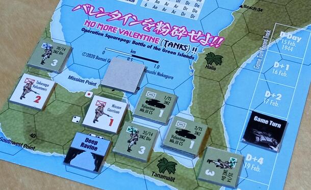 A small postcard game on the landing operations by the US and New Zealand forces on Nissan Island, the Green Islands, on February 15, 1944 (operation Squarepeg). The game features a standard "I go-you go" mechanics but with unlimited movement subject to fatigue (the more you move, the higher the possibility of being fatigued). The NZ player must conquer...