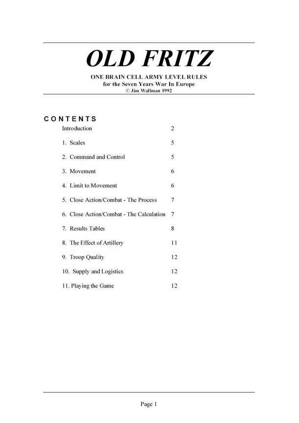 Old Fritz: One Brain Cell Army Level Rules for the Seven Years War In Europe. Excerpts from the rulebook: "These rules were first devised some considerable time ago as an alternative to the mainstream of tabletop figure wargames, to find, through a different approach a radically faster method for calculating the results of inter-unit combats." "So...