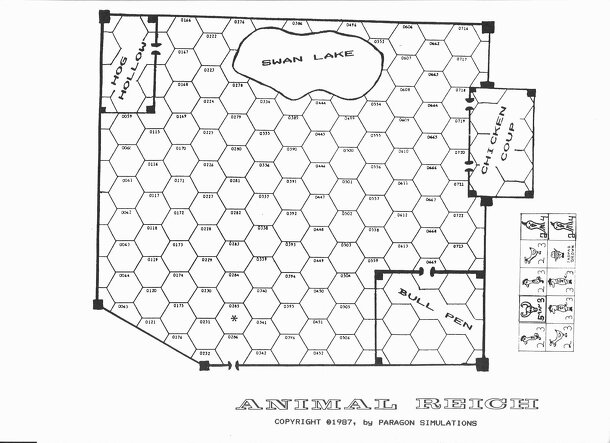 Animal Reich was included free with the program of the 1987 GamesCaucus held in the San Francisco Bay Area. It is loosely based on the novel, "Animal Farm" by George Orwell. One player takes on the role of the animals. The other player takes on the role of Farmer Brown. The goal of the animals is to kill Farmer Brown, while the goal of Farmer Brown is to...