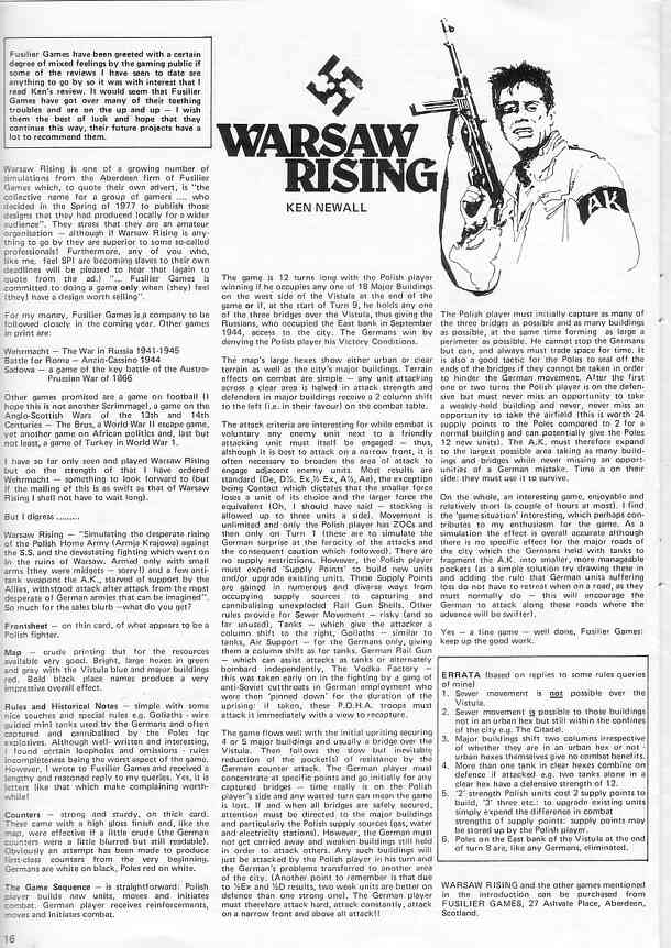 This wargame depicts the struggle between the Polish patriots of the Armja Krajowa and the German garrison in 1944. The 120 units in the countermix include the Hermann Goring Division, SS Cossacks, and wire guided mini-tanks called Goliaths. The 23" x 17" map represents Warsaw and the suburbs on both sides of the Vistula River. Combat can be affected by...
