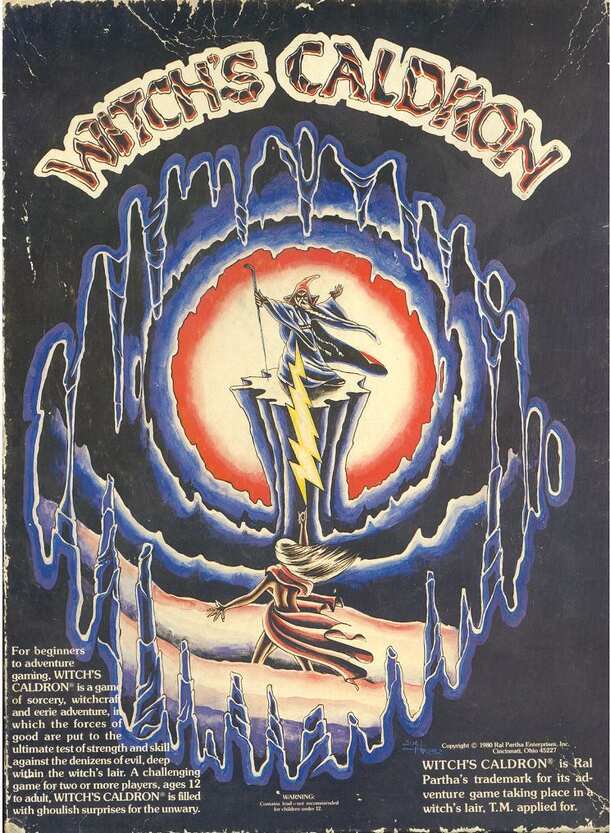 One of Ral Partha's introductory miniature games, Witch's Caldron is essentially a miniatures dungeon crawl, with adventurers (led by a wizard) trying to explore the witch's cave and escape with valuable treasure. The witch, with a variety of monstrous servants, opposes them. The adventurers may explore in multiple parties from three entrances. The game...