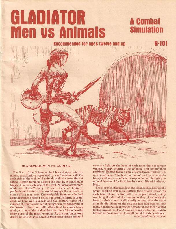 Gladiators of Rome is a simple solitaire game depicting gladiator fights in ancient Rome. You are the gladiator and the system controls your opponents. Rules, combat tables, gladiator counters and ratings are provided but you must supply two dice and scrap paper. The game is played without a map and the object is to reduce your opponents' endurance to zero...