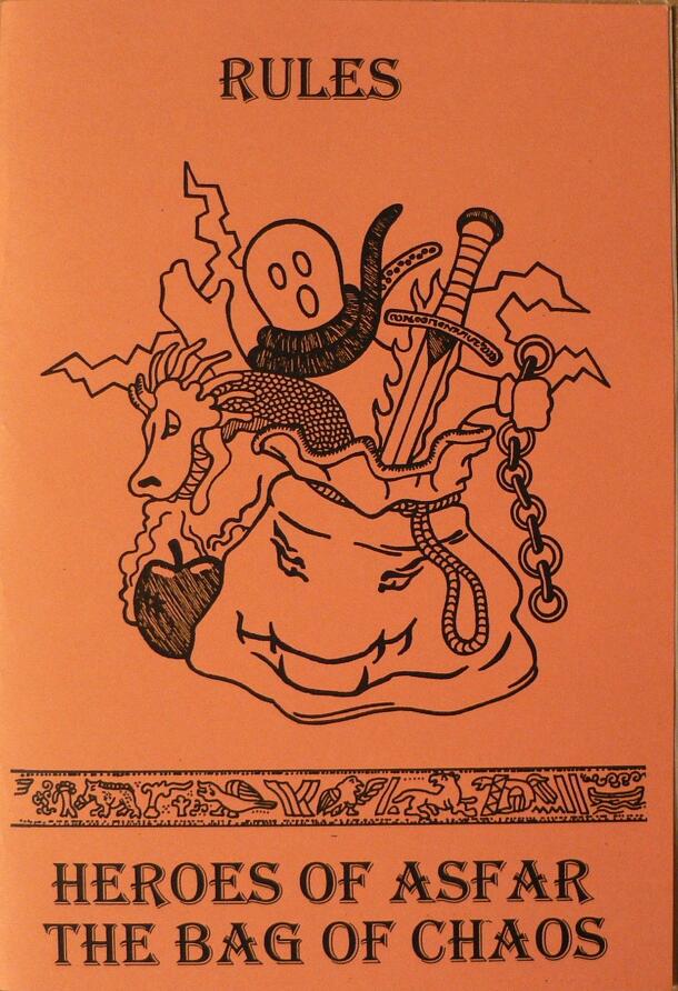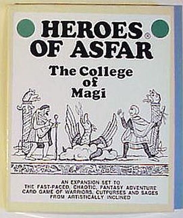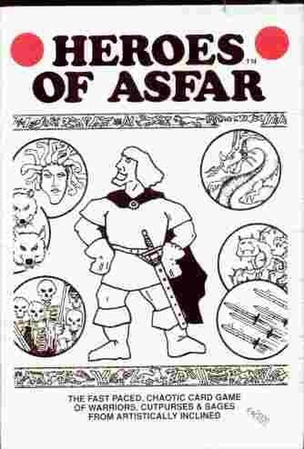 Heroes of Asfar is a fairly simple card game of fantasy combat (for no stated reason). Character cards each show an illustration, name, point value, usable weapon, and special abilities (such as spell casting, thievery, immunities, or bonuses). Each player begins with 6 random character cards, arranged into two ranks, and a hand of 5 weapon cards. Players...