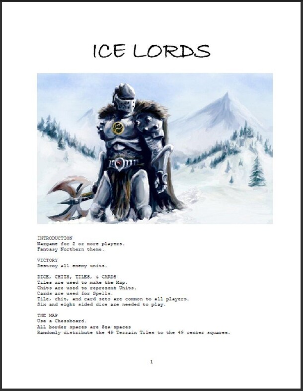 "Wargame for 2 or more players. Fantasy Northern theme. Victory: Destroy all enemy units." The game is played on a chess board or other 8x8 grid. Map tiles are randomly distributed in the center 49 squares, the border squares being considered sea spaces. The terrain tiles come in eight different types: tundra, glacier, water, villages, forest, mountains...