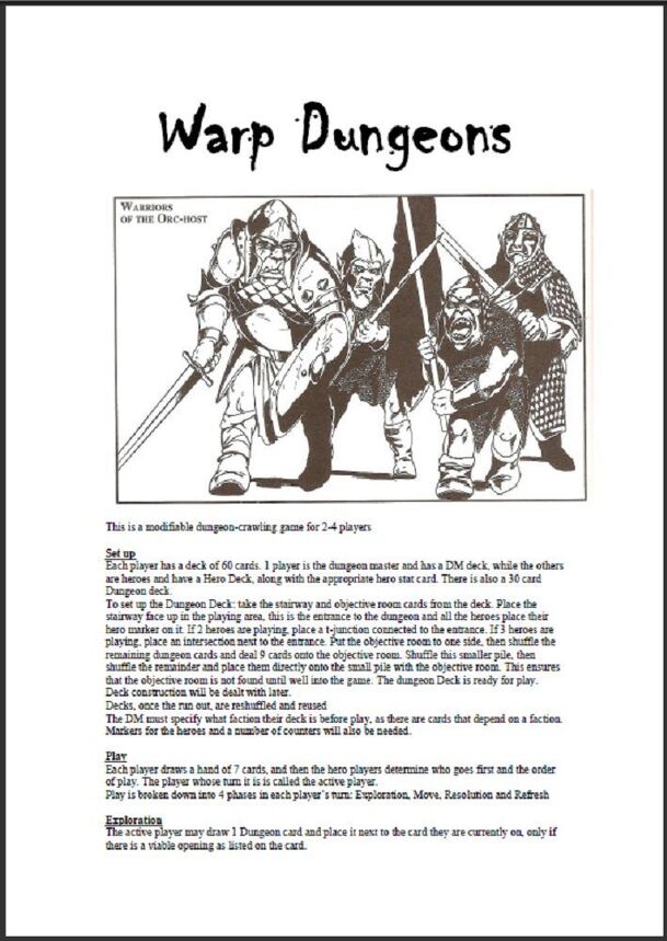 "This is a modifiable dungeon-crawling game for 2-4 players." One player takes on the role of the Dungeon Master. The other players each control a Hero who is exploring the dungeon. The game uses three to five custom card decks: a DM Deck (60 cards), a Dungeon Deck (30 cards), and a Hero Deck for each Hero player (60 cards.) The Dungeon Deck consists of...