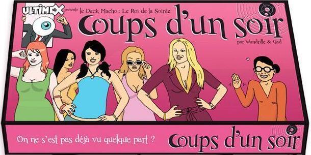 literally translated by: whore trick Players score points by doing dirty tricks in a specific situation by associating cards in their hands. The dirtiest one scores (decided by the current GM player). Rules also change from turn to turn. Players keep going until one reaches 5 points. —user summary Le nouveau jeu by Topito : soyez la pire enflure et...