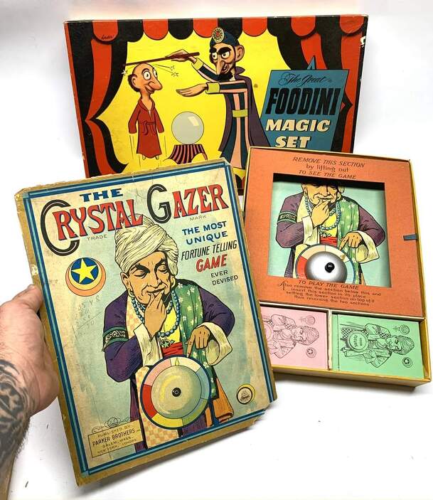 This game is probably a forerunner to "The Black Cat Fortune Telling Game". Unlike BC, however, it has an actual (albeit simplistic) game to play. The game has 6 groups of 4 cards, and each group tells a different fortune... RED CARDS which tell your PAST WHITE CARDS which tell your PRESENT GREEN CARDS which tell your FUTURE BLUE CARDS which tell your LOVE...