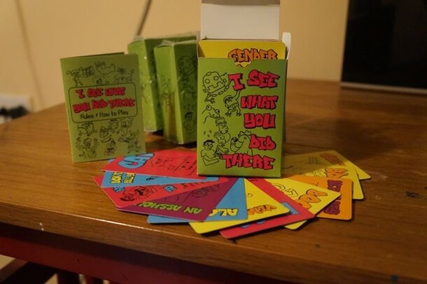 I See What You Did There is a game about convincing your friends that you're clever. Convince them by relating the cards using any means of interpretation necessary. Every card has a word on the top half and a game instruction on the bottom half. Players either use the abilities detailed on the bottom half card (ex: While this card is in play, players must...