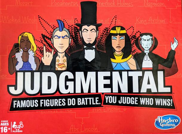 Description from the publisher: Judgmental is a party game in which famous figures do battle and players decide who wins. Each player secretly chooses a contender card from their hand, and those cards are dealt into a bracket. Match-ups are decided by unique and silly contests, and a vote by all players determines the victor. You win if your chosen...