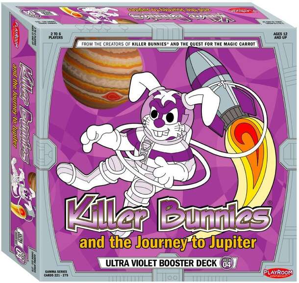 Game description from the publisher: The Journey to Jupiter returns to a solar system near you with the Killer Bunnies and the Journey to Jupiter: Violet, Orange and Green Booster Combo Deck. With "Floating Muffin Tops", powerful Specialty Ships, and 9 additional sectors of space for your bunnies to explore. Using Specialty bunnies makes forming a Triplet...