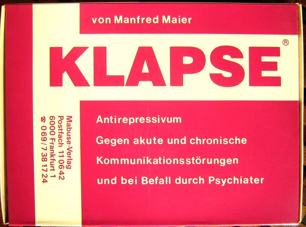 Klapse - German for "Nuthouse" - is a Monopoly-like roll-and-move game with a strong satirical approach. There are two "circles" - the "locked ward" and the "open ward" - for the pawns to walk around and step on "event"-spaces of different kinds: New diagnosis, several events ... The players try to get their pawns from the "locked" into the "open" ward and...