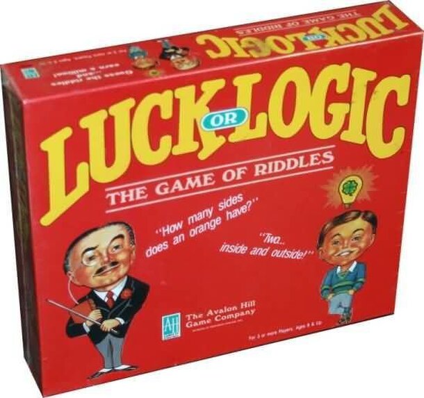 Billed as 'The Game of Riddles', Luck or Logic is a light game that will appeal to anyone who enjoys strange humour and paronomasia. Players roll a die to move around the board, collecting money from artifacts purchased and from answering riddles. Some of the riddles can be answered through logic: Q. How do you stop a kid from crying in the back seat? A....