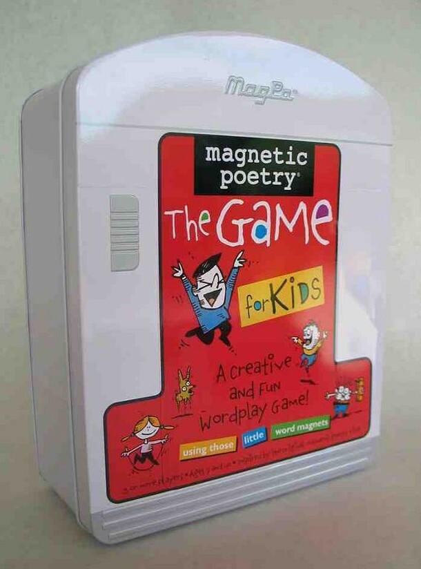 Be the first player to make it from the vegetable crisper to the freezer by win four poem-writing rounds. One player is the judge, who spins a spinner to select the poem category (gross, sad, mad, pretty, silly, happy, gross) The remaining players write poems, based on a subject selected from their hand of subject cards, and using magnetic word tiles...