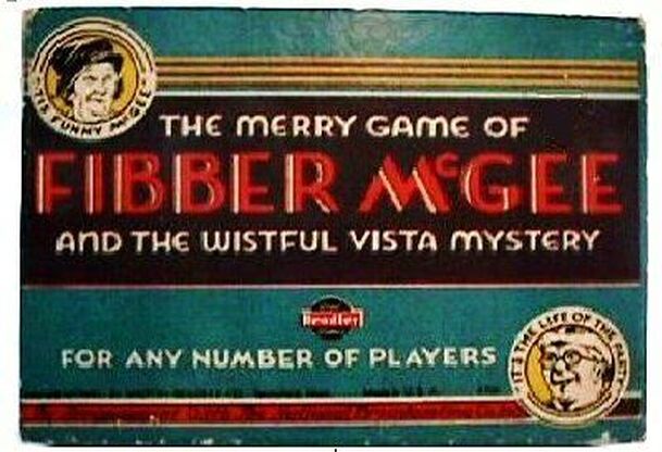 "A hilarious party game for any number of players. A riot of fun for everyone - take it from me! - Fibber McGee ...by Arrangement with the National Broadcasting Co. Inc." A large deck of yellow cards are placed face down on a table in a loose spread out pile. Each card has a few words that make up a partial sentence on them. One player reads a story out of...