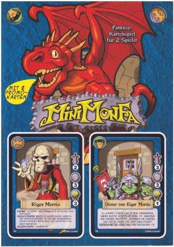 Two promotional cards for the game MiniMonfa. MiniMonFa is a 2-player, non-collectible card game that allows you to become an Archmage who must set up his dungeon in order to defend himself from the ongoing attacks of the local heroes, always covetous of glory, treasures, and experience points. You have to build your dungeon with great mastery and shrewd...