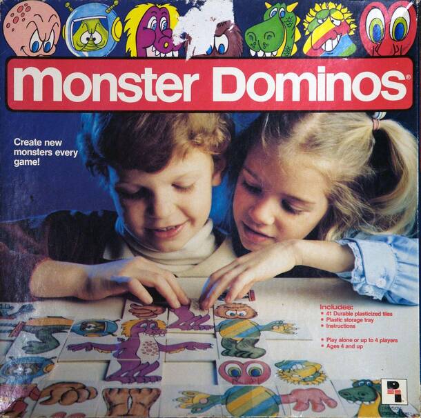 "Create new monsters every game" Players build fanciful monsters using rectangular tiles. The tiles have arms, legs, heads, and torsos that match up to create different monsters. The first player to use up their pile of ten tiles will win the game. There is also a puzzle variant for solo play. Includes 41 monster tiles, storage tray, instructions. Playtoy...