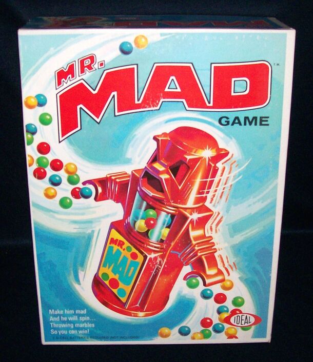 "Make him mad and he will spin... Throwing marbles so you can win!" Mr. Mad requires 2 D-cell batteries. The object of the game is to be the first player to get rid of all their marbles. All players select a particular colored group of marbles to represent them during the game. Players start the game with 8 marbles; all do not belong to that player but are...