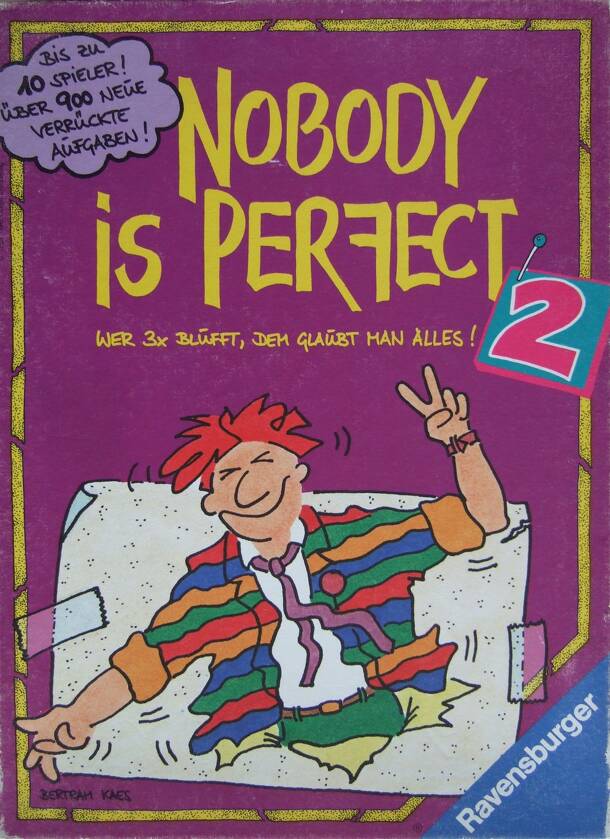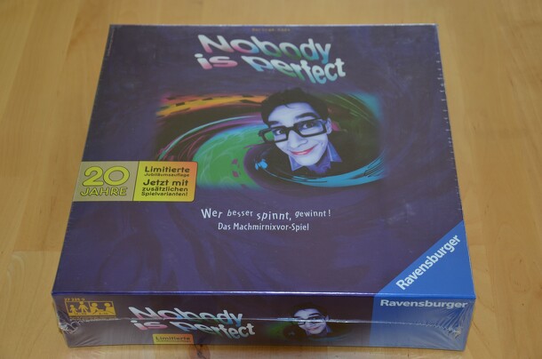 Nobody is Perfect is a party game. Each round the start player draws a card with a complicated word or technical term on it, with the meaning of that word given on the card as well, but only visible to themselves. Everyone then invents an alternative meaning for that word and writes it down while the start players notes down the correct answer. They then...