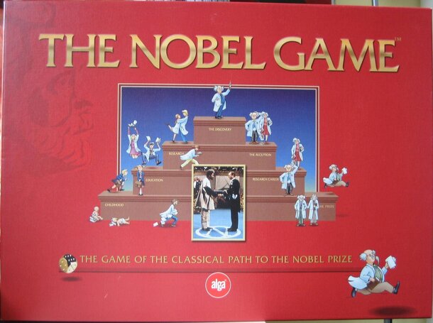 Nobelspelet is a Chutes and Ladders type of game with humorous (but still somewhat realistic) depictions of the steps in a scientific career. Players roll a golden six-sided die and move along the path from birth to the Nobel prize. Good rolls move you ahead fast, poor rolls give you long detours or move you backwards. Ironically (or not!) this game to win...
