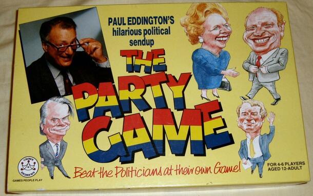 Political Party Game, that is. Players compete to earn votes in a roll and move, draw a card game. Answer quiz questions, make 60 second speeches, climb the ladder of success or slide down the greasy pole. Cash your votes into rosettes in your party color which you place on a map of Britain, most rosettes wins. The packaging is themed with photos of Paul...