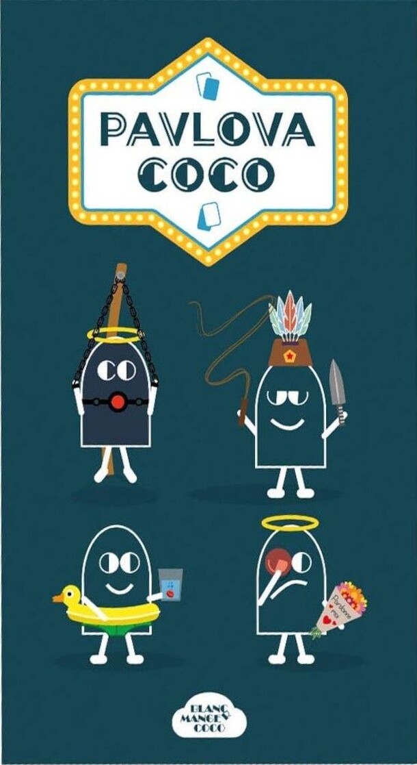 Pavlova Coco is Blanc-mange Coco with drawings: each player tries to create the funniest comic book possible with 3 cards. In Pavlova Coco, each player receives 11 cards with drawings depicting the men from the Coco Blanc-Manger game on a beach. The objective is to make other players laugh by forming a comic book with 3 cards. A game is played on 4 points....