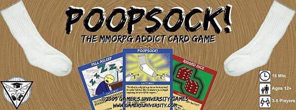 This game has been unpublished as of 2012 pending a complete overhaul and some quality control. It will be back, I promise. -In a nutshell- Not for the easily-offended, Poopsock! Is a simple satirical card game in which a group of MMORPG addicts are playing their newest game of choice tirelessly to be the first to Maximum Level. Every round represents a...