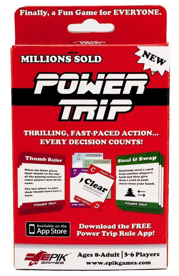 Power Trip is a thrilling, fast-paced card game that can change directions at any time. Players race to get rid of all their cards first by attempting to match or beat the cards played by others, or by playing a Clear or Power Trip card to clear the discard pile. The first player to do so becomes the Ruler. Be the first player to become Ruler three times...