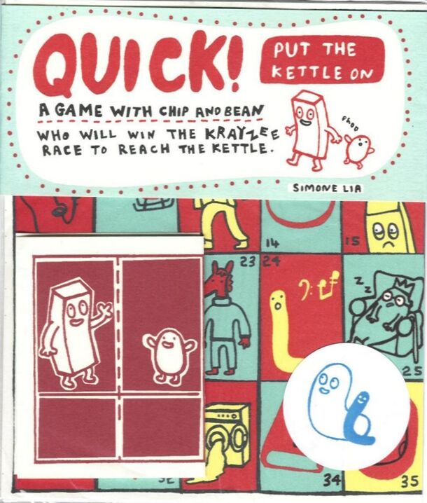 This is a Snakes & Ladders-like game designed by cartoonist Simone Lia, themed around some of the recurring characters from her comic strips. From the instructions: "Each player chooses a character. There are six to choose from: Chip, Bean, Worm, Robot, Snail and Sad Cloud. The aim of the game is to be the first player to get to square 40 to 'Put the...