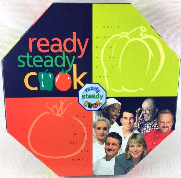 A board game based on the hit TV show. Two teams (the Red Tomatoes or the Green Peppers) make their way from the backstage dressing room through the Ready Steady Cook studio past various countdown squares before reaching the Stop Cooking Sign. Each team must answer food trivia questions based on the following categories to successfully navigate the board:...