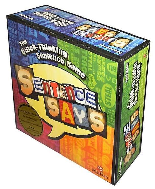 The components of Sentence Says are: 4 sets of oversized cards: vowel cards, consonant cards, action cards and steal cards, 4 oversized sand timers: 15, 30, 45, and 60 seconds and 1 oversized custom die. The object of Sentence Says is to create a sentence out of letter cards that you are dealt, using each letter as the first letter of a word of your...