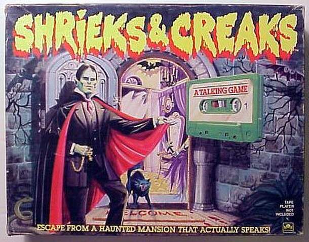 "Shrieks & Creaks" is a cassette-driven game featuring a Talking Tombstone. Players move from room to room and use both the room keys and their own character key to try to advance. A tombstone-shaped speaker attaches to a standard cassette player. The speaker will only allow sounds through if the right combination of room and character key are put into it....