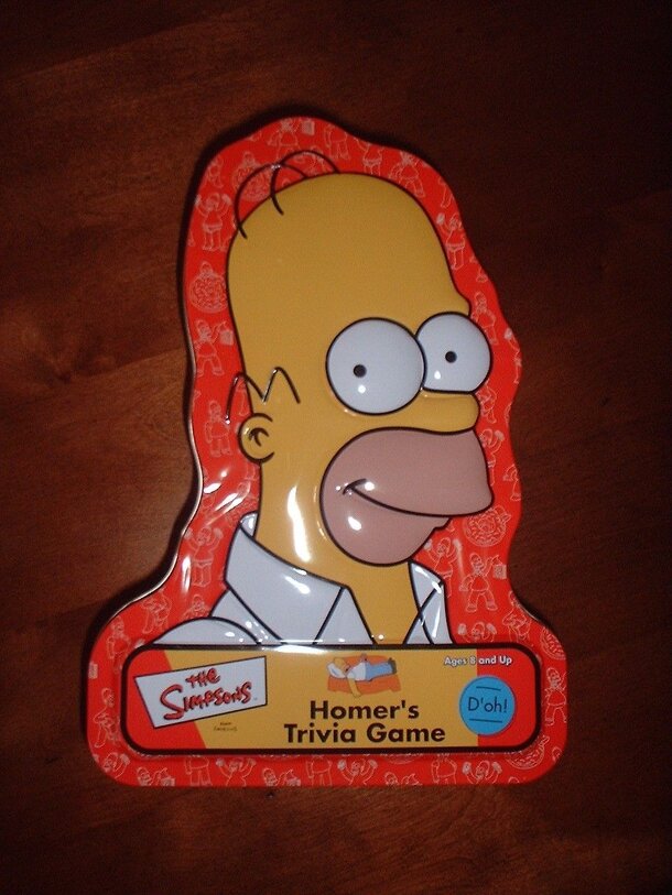 (From the box, weird punctuation and grammar preserved) The Simpsons: Homer's Trivia Game Hello, I'm Homer J. Simpson! Everybody knows that I have only two hairs on the top of my head (d'oh!) But do you know why I lost most of my hair? Or why my frumpy, old maid of a sister-in-law Selma has no sense of smell or taste? No? Well, don't fret like that pansy...