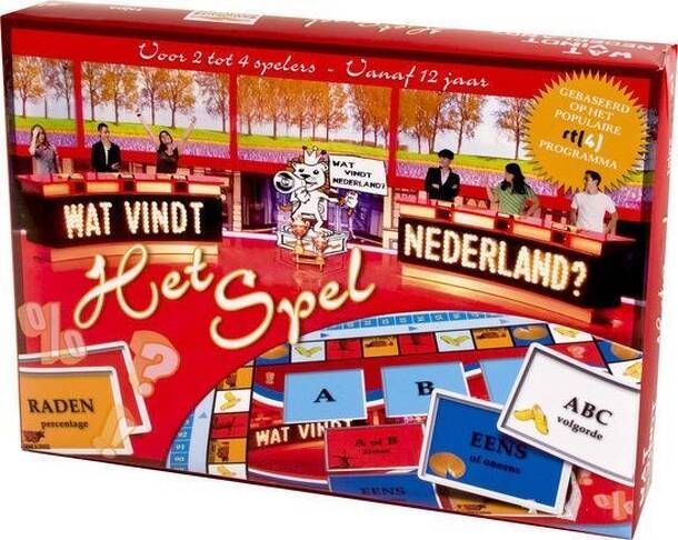 The boardgame based on the popular Dutch television show "Wat vindt Nederland?" in which two teams compete against each other, trying to find out what the general Dutch opinion is. Teams will get a statement - mostly based on recent events - and have to try and guess what the opinion of the Dutch public is on the statement. Whichever team is closer, wins...