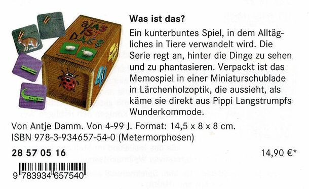 Discovering something special in every-day life and transforming it creatively – with the new memo game What is this? and a bit of skill anyone can achieve it. With motives by the renowned children's book illustrator Antje Damm, MeterMorphosen is finally introducing a memo game for children that is more challenging than the usual memo games as its pairs...