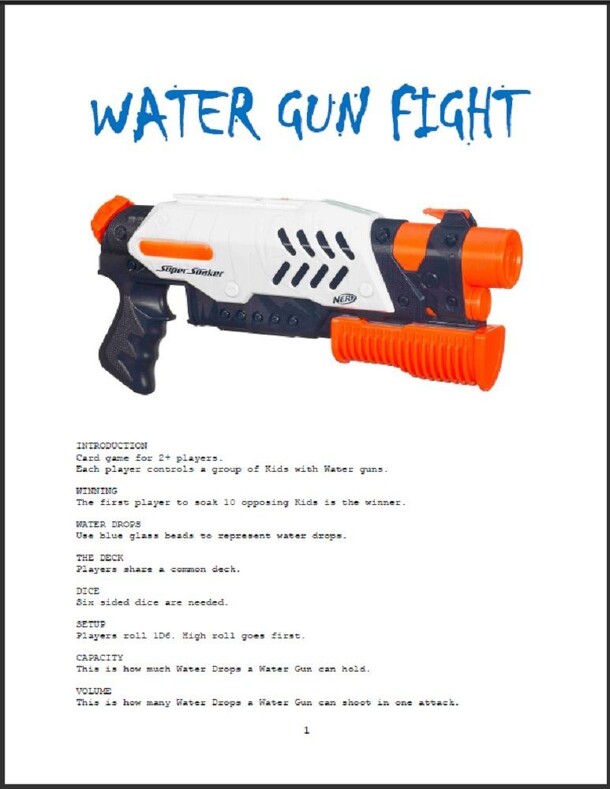“Card game for 2+ players. Each player controls a group of Kids with Water guns.” The winner is the first player to soak ten opposing kids. The card deck includes twenty-three different types of water guns, each rated for Volume (amount of water expended per attack) and Capacity (amount of water held). There are also cards for each type of Kid, rated for...