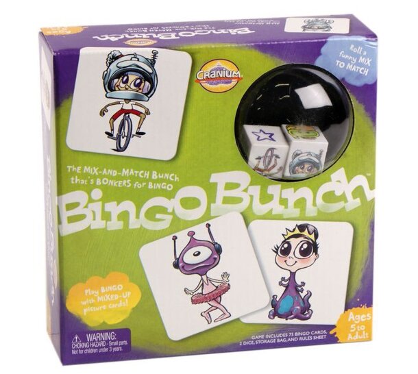 Contents 2 Special die 32 cards to make two boards in 4x4 grid instructions cloth drawstring bag Made exclusively for Starbucks Coffee stores. Bingo Bunch uses 2 special dice with pictures of cartoon heads and bodies that when rolled match 75 cards depicting the various combinations of the dice. (25 combinations are possible, with each card repeating 3...