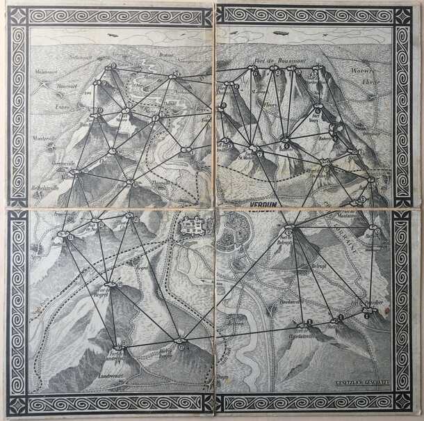 This is a late-WWI or early post-war German game depicting the struggle for Verdun. The game board shows an oblique overhead view from the south of the town and citadel of Verdun, surrounded by hills, forts and batteries, and with airships floating over the distant northern horizon. The game appears to be one of point-to-point manoeuver, but the rules are...