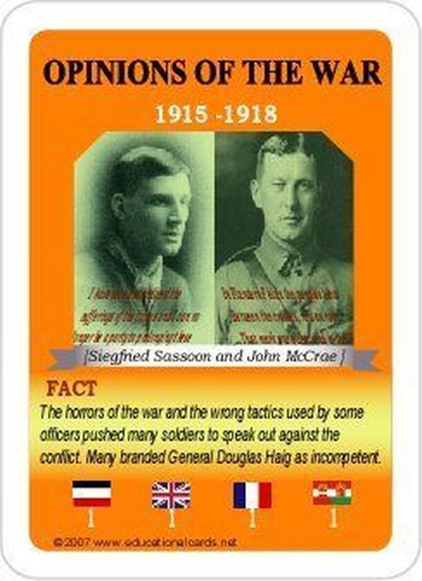 WORLD WAR I ww.educationalcards.net ULES (for 3 or 4 players) AIM: To collect and arrange six Nation-related card events in chronological order. Each player represents a Nation and must collect cards whose events are relevant to their Nation. The timeline must contain the following suits: One "Pre-War Event" card (Purple cards) - Four "War Event" cards...