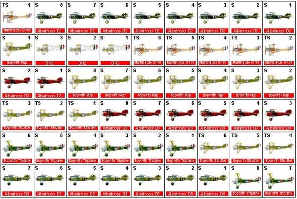 Fast play air-to-air combat miniatures game for WWI planes similar to the game Instant Thunder and Instant Bandits. The game uses a rectangular grid with playing card suits marking 4 rows and cards K to A marking 14 columns. Planes have individual flight characteristics for vertical and lateral movement, as well as armament and structural points. Each turn...