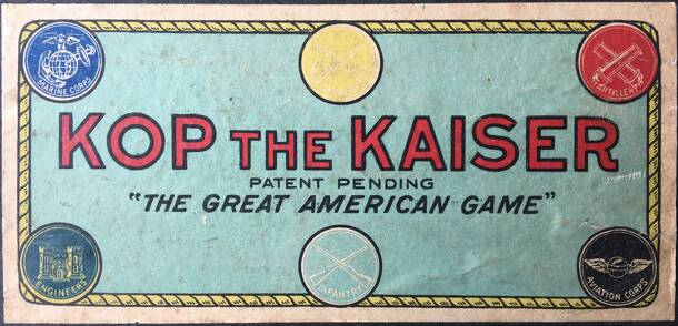 This is a roll-and-move game published to mark the U.S. entry into World War I. It allows up to six players, each representing an arm of the U.S. forces: Infantry, Cavalry, Artillery, Marine Corps, Engineers and Aviation Corps. The board has a circular track and six spokes leading inward to the center of the board. Each player starts on the space...