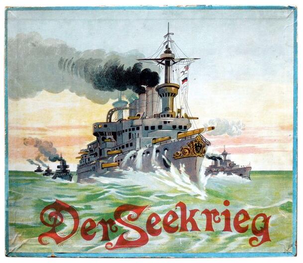 This is a lavishly illustrated German roll-and-move game from early in WWI that, possibly for the first time ever, showed the emerging role of aviation in naval warfare. The overall narrative of the 90 space inward spiral track is of navies grappling to find one another, with ships firing and sinking, distressed sailors being rescued, and even a school of...