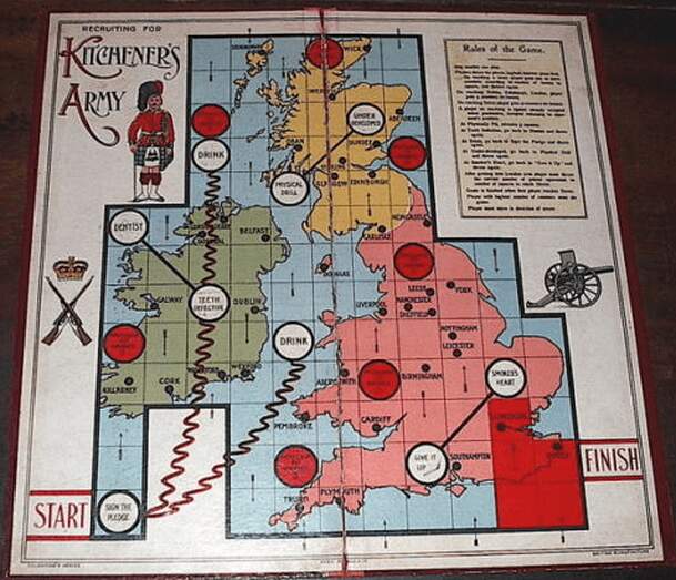 Goal: Collect as many (visiting = recruits) counters as possible before a player reaches Dover Game is played on a board carrying a map of the British Isles. Players move round the map according to the throw of dice. Similar to 'Snake and Ladders' you gain or loose movement points, depending on the space your turn ends (==> see table on the board). Luckily...