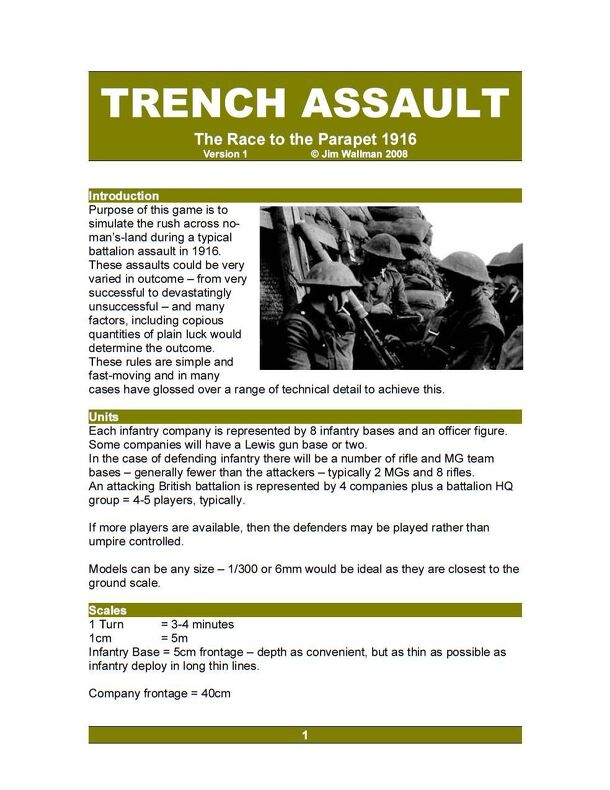 Trench Assault: The Race to the Parapet 1916. From the rulebook: "Purpose of this game is to simulate the rush across noman’s land during a typical battalion assault in 1916. These assaults could be very varied in outcome - from very successful to devastatingly unsuccessful - and many factors, including copious quantities of plain luck would determine the...