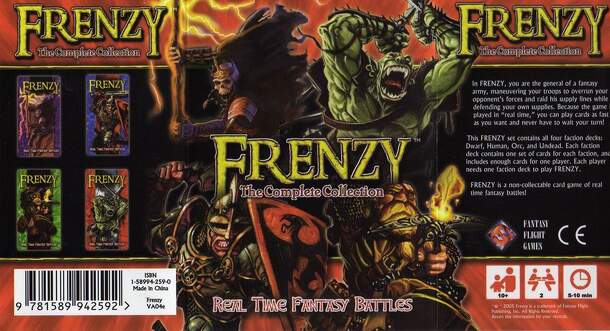 Frenzy! is an innovative, fast-and-furious non-collectible gaming approach to fantasy battles, where players must manage a real-time skirmish evolving before them, while carefully keeping a watchful eye on their supply lines. The game has four different races with Orcs, Knights, Undead, and Dwarves each represented in their own furious strength, skills...