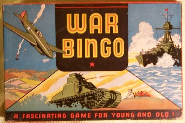 This colorful game of the latest American war machines will prove of interest to young and old alike. There are ten types of pictures. Each player selects 15 at random and places them face down on bingo card. Then turns them face up and by discarding and getting new pictures, tries to create various picture combinations. Highest points awarded for 5...